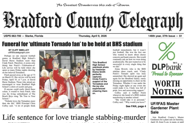Mrs. Cindy Futch Friday, April 10 7 p.m. David Hurse Stadium 515 W. Adkins St., Starke Bradford High School Please wear Bradford Tornado colors!
