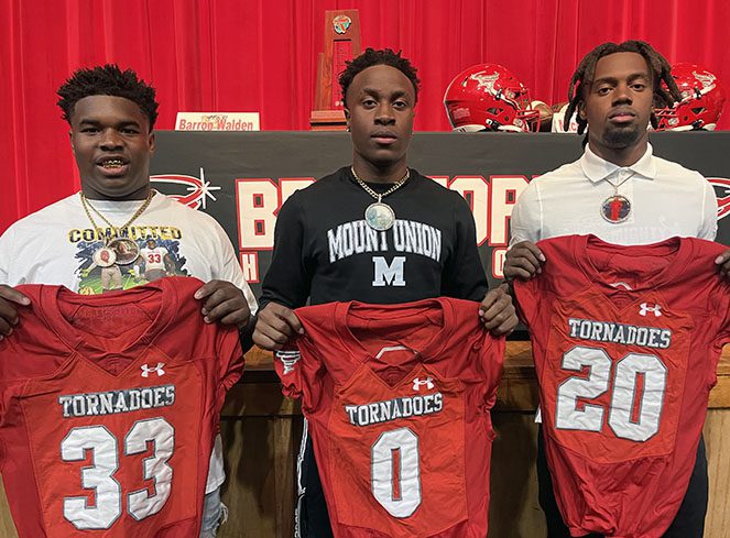 Barron Walden, Michael Oliver and Trevis Johnson (l-r) signed letters of intent to play football at the next level. Walden will be going to Mount St. Joseph University in Cincinnati, while Oliver and Johnson will both be going to the University of Mount Union in Alliance, Ohio.