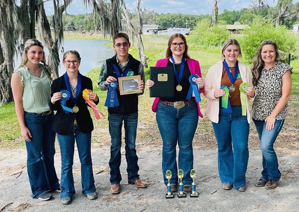 2023 State Champions. Pictured (l-r) are volunteer coach Carson Willis, Shayna D., Tanner C., Bailey J., Bailey V. and Coach Lizzie Whithead, UF/IFAS Bradford County Extension Livestock Agent.
