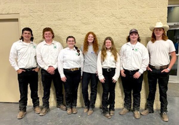 Livestock Judging Team members showing off thier jackets. Pictured (l-r) are agent Lizzie Whitehead, Regan B., Tanner C., Shayna D., Bailey J., Ansley W., Bailey V., Cayman B., and Carson Willis.