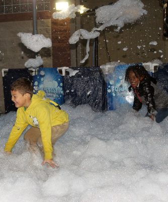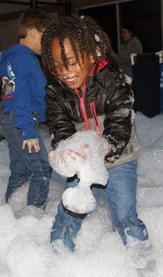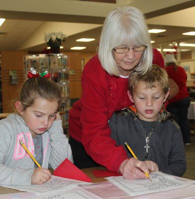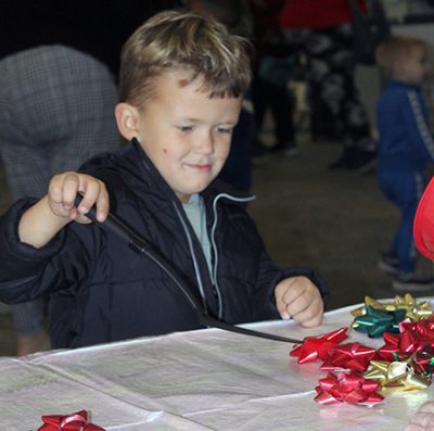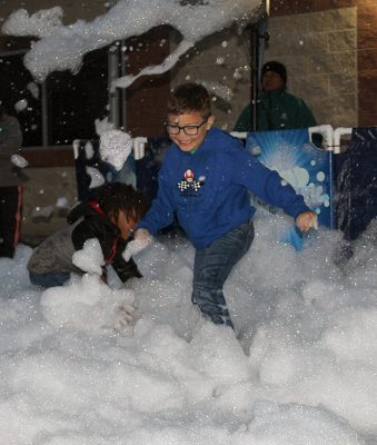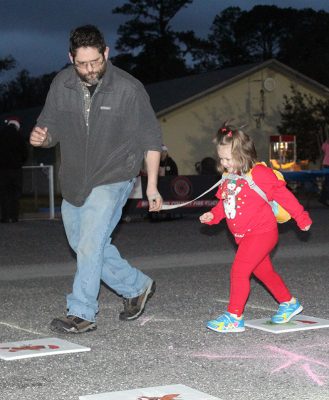 Tayden Hallam puts his letter to Santa in the North Pole Express mailbox at the Bradford County Public Library as part of Santa’s Winter Wonderland Christmas Carnival, which was held Dec. 14. Photo by Cliff Smelley.Santa’s Winter Wonderland Christmas Carnival wouldn’t be complete without Santa himself. Children, such as Emerson Webb (left) and Ensleigh Webb, were able to meet him and, of course, tell him about the special things they’d like for Christmas. Photo by Cliff Smelley.Ensleigh Webb lets Santa know what she’d like for Christmas. Photo by Cliff Smelley.Thanks to Foamtastic, children like Heath Blandford and Jessiah Hyman (background) were able to enjoy a snow-like experience. Photo by Cliff Smelley.Jessiah Hyman scoops up a handful of foam. Photo by Cliff Smelley.Connor Blandford (left) and Jessiah Hyman are having a good time playing in what counts as Florida snow. Photo by Cliff Smelley.Jeremiah Crews (left) participates in one of the inside games, which was manned by Kenny Quinn. The event had activities inside and outside. Photo by Cliff Smelley.Lillian Levine (right), accompanied by Adam Levine, enjoys taking part in the cookie and candy walk. Photo by Cliff Smelley.Kaise Lemire scoops up Christmas bows at one of the games available for children to play. Photo by Cliff Smelley.Heaven-Leigh Lamb (left) watches Draco Mitchell make a move as they play a game aginst each other. Photo by Cliff Smelley.Dallas Lee tries his luck at throwing a ball into a bucket. Photo by Cliff Smelley.Skyla Hallam (left) and Tayden Hallam, with assistance from Cindy Griffis, write letters to Santa. The library had mailboxes to drop the letters in, ensuring that they’ll find their way to the North Pole. Photo by Cliff Smelley.Members of the Kiwanis Club of Starke, including (l-r) Nelson Green, Dale Woodruff, Cheryl Canova, Bear Bryan, Pat Mundorff and Richard Cason, served up free hot dogs. Photo by Cliff Smelley.