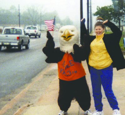 Lyn (in the eagle costume) and Danielle Kramer drum up support at a remote from Starke’s Chevrolet dealership.
