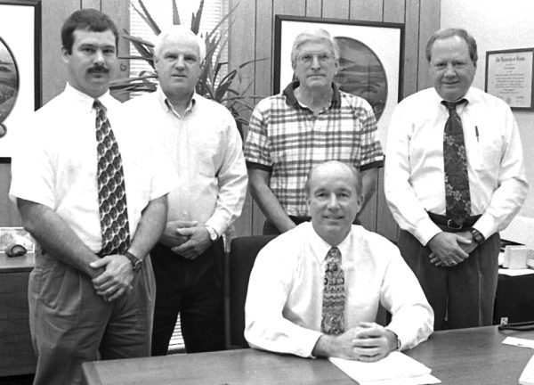 Clay Electric’s Orange Park District leadership team in 1999. District Manager Ricky Davis (seated). (L-r) Andy Chaff, Wilbur Padgett, Len Cerato and Kerry Paige. Photo: Clay Electric Cooperative.
