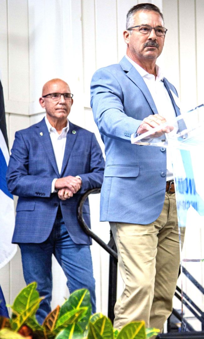 Incoming Clay Electric CEO Andy Chaff addresses the co-op’s employees while retiring CEO Ricky Davis looks on. Photo: Clay Electric Cooperative.