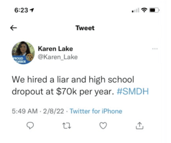 “We hired a liar and a high school dropout at $70K per year,” Lake added in a tweet the following day.