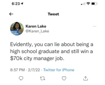 “Evidently, you can lie about being a high school graduate and still win a $70K city manager job,” Lake wrote on Twitter on Feb. 7.
