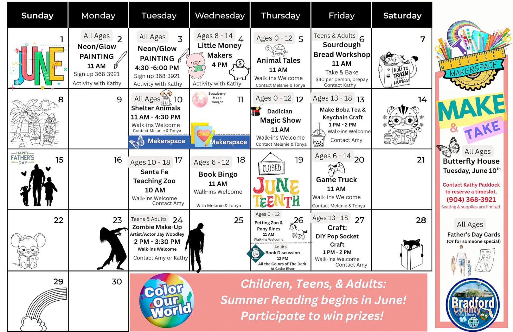 Among the June events are neon glow painting for all ages on June 2 at 11 a.m. and June 3 at 4:30 p.m. Sign up by calling 904-368-3211.