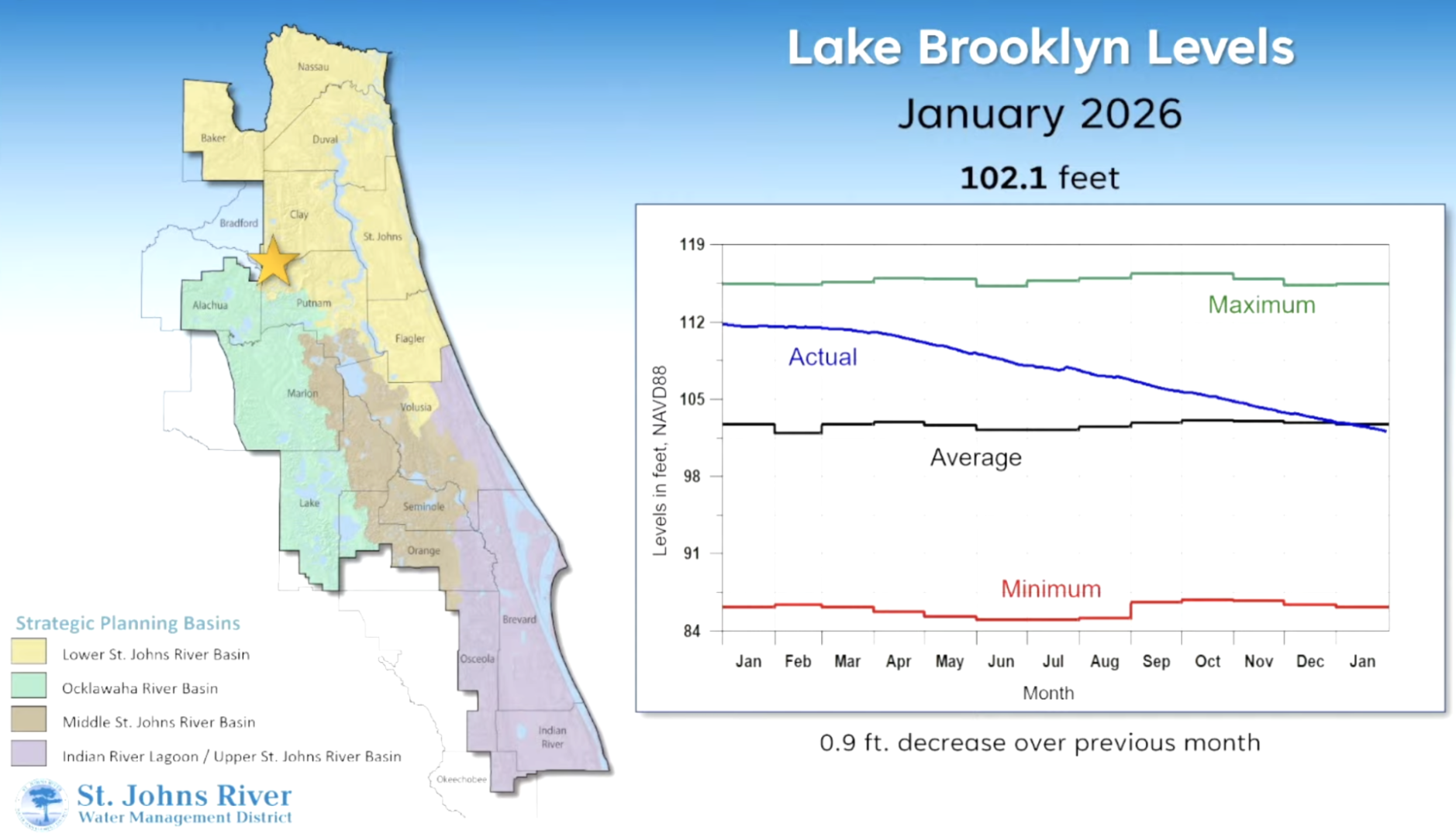 Lake levels declined across all monitored sites. Lake Brooklyn saw the steepest drop, falling nine-tenths of a foot and ending the month just below its historic average. Lakes Weir, Winnemissett, and Apopka remained above average levels despite small decreases, while Blue Cypress Lake dropped below both its regulation schedule and average water level.