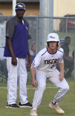 Jiwan James (left) and Blake Agner watch an at-bat from third base during a game this past season, which was James’ second year as an assistant coach at UCHS. File photo by Cliff Smelley.