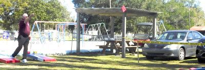 Raiford Mayor Lamar Griffis brushes up his skills on the cornhole game before anyone comes to challenge him.