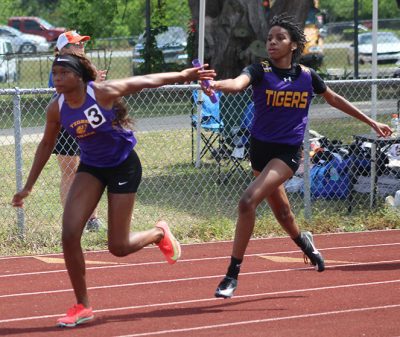 Amia Bethea (left) receives the baton from Brianna Taylor in the 4x100m relay. The Tigers placed third.