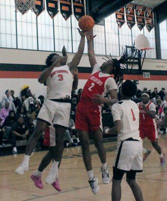 Breion Johnson (center) battles Hawthorne’s Dominck Harvey for a rebound.