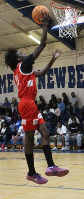 Maliki Cobarris (center) goes up for a shot against Newberry’s Logan McCloud (far right), while Newberry’s Jacob Green attempts a block from behind.