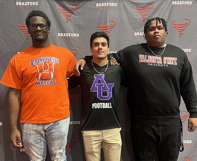 Bradford High School senior football players Kyren Green, Wilmarius Jackson and Jackson Parmeter signed letters of intent to play football at the next level during a Feb. 4 signing ceremony in the school’s auditorium.