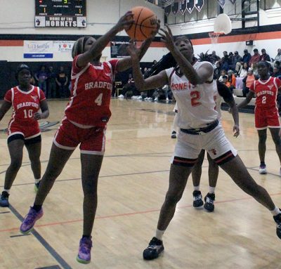 Hawthorne held the ball and milked more than a minute off the clock before the Tornadoes started fouling (Bradford had no team fouls before the Hornets’ possession). With 1:34 to play, Ranicia Coleman was fouled while shooting. She made 1 of 2 free throws for a 41-34 Hawthorne lead. Rhamani Sheppard-Rentz then had a steal for the Hornets, which led to Adams getting fouled on her way to the basket. Adams made both free throws with 1:08 to play.