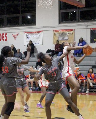 Jada Hankerson (second from right) drives to the basket in the third quarter. She scored 11 points in that quarter and finished with a game-high 16 points. Photo by Cliff Smelley.