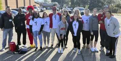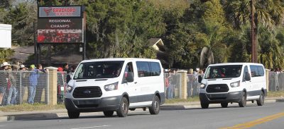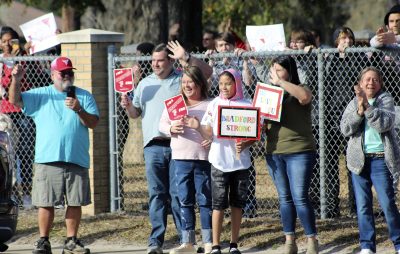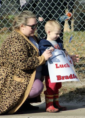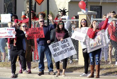 Students, family members and others from the community lined U.S. 301 in front of Bradford High School this morning to give members of the girls weightlifting team an enthusiastic sendoff as they began their journey to the Class 1A state finals, which will be held Saturday, Feb. 12, at Port St. Joe High School.