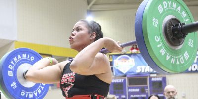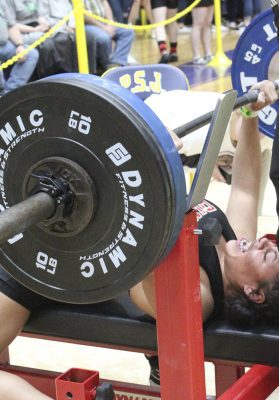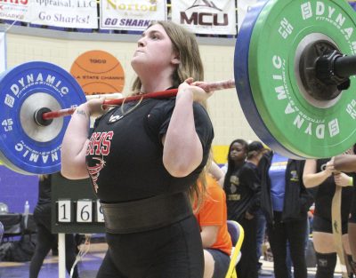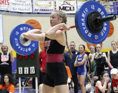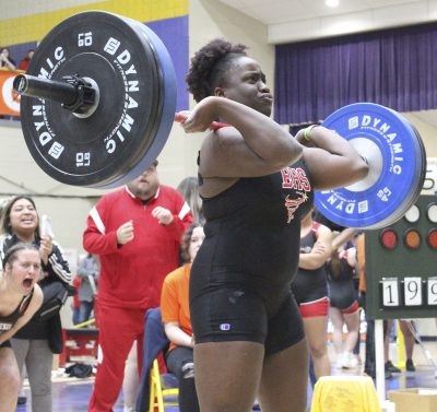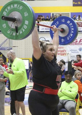 She did just that. Her bench press of 180 was a 20-pound improvement from last year’s state finals, while her clean and jerk of 200 was a 30-pound improvement.