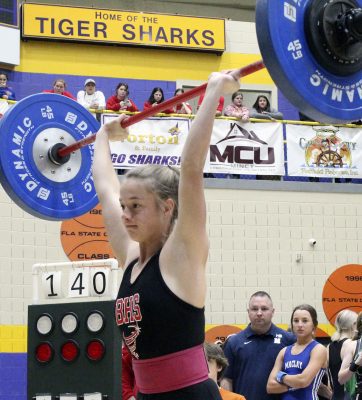 McFarland did 125 on her first clean-and-jerk attempt. Griffis then told her if she wanted to finish ahead of Suwannee’s Cheyenne Morgan, she needed to do 140. He said her response was, “Put 140 on the bar.”