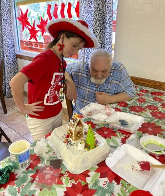 A cake-decorating competition paired each Parkside resident with a cheerleader. Each team received a can of icing and a box of supplies and had the following rules to adhere to: Each cake had to have a Christmas tree and a gingerbread house as well as either a snowman or gingerbread man.