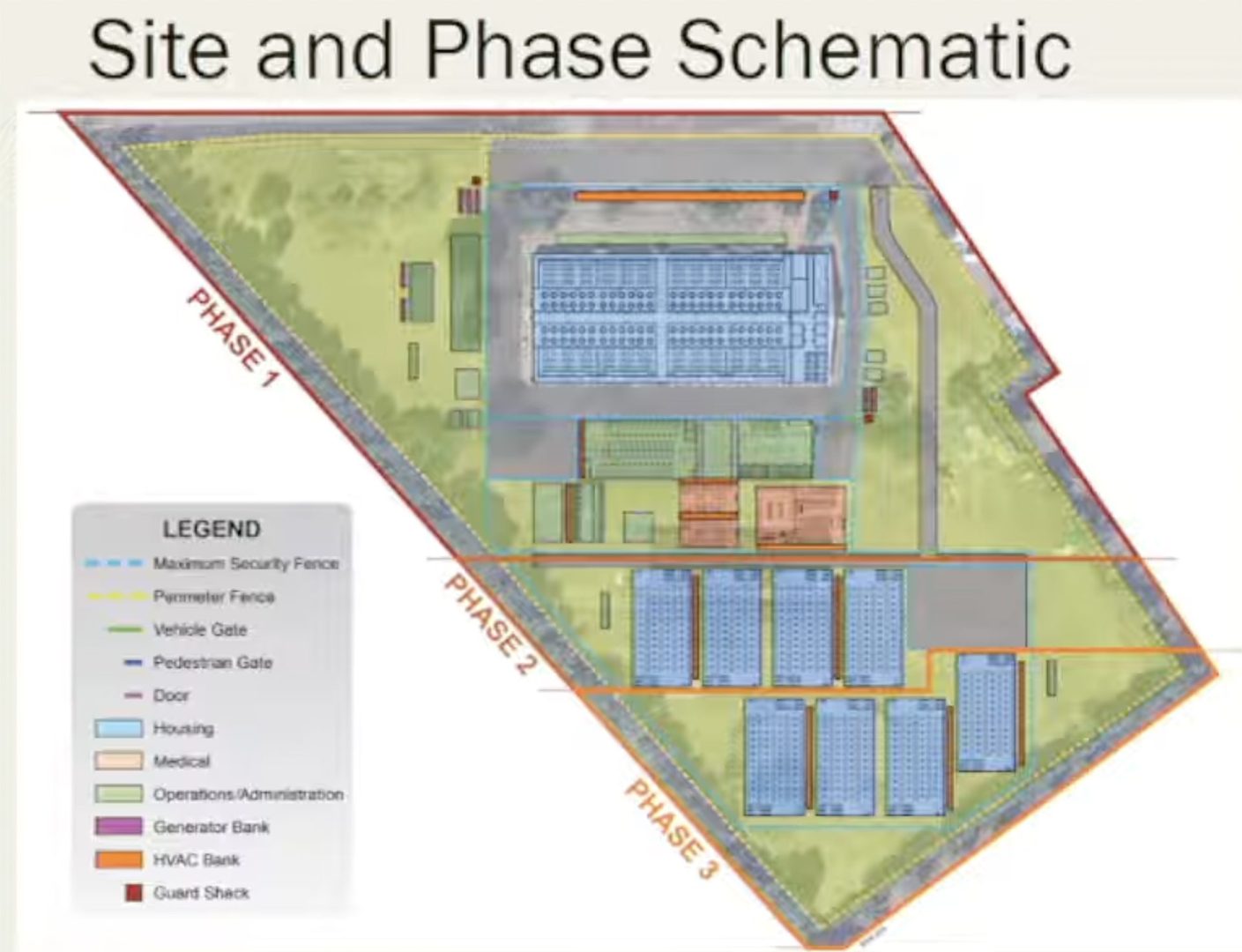 The warehouse would be converted to detention housing, with portable buildings brought for administration, dining facilities, etc. Additional detention pods would be added to increase the population in future phases. The site would be “low profile” because of obscure fencing, Chiappinelli said. Significant infrastructure improvements would be needed for electricity, water and sewer, and any permanent improvements would remain when it no longer served its proposed purpose.