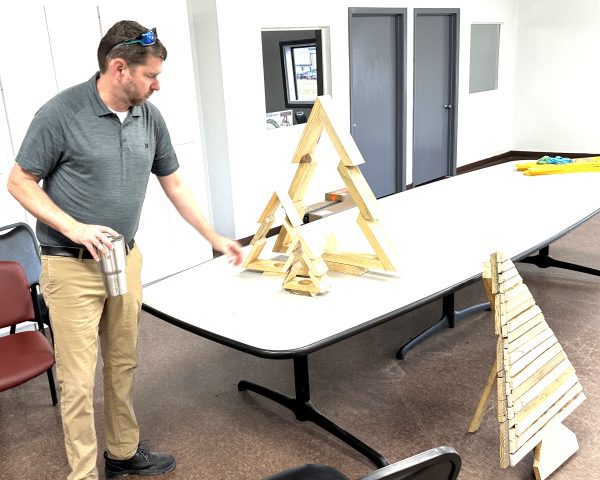 The Arc’s woodshop is expanding its inventory to include raised planters, picnic tables, and Christmas yard decorations, which John Williams displays here. This will allow the shop to offer more products to the general public.