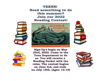 Children’s book bags, for ages 2-12 years of age, will be available through the end of June or until supplies run out. Remember to turn in your completed Reading Logs to be entered into prize drawings.