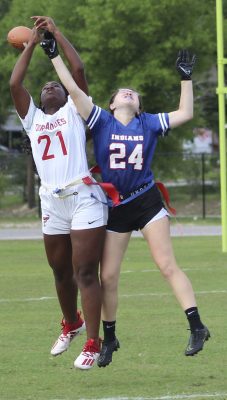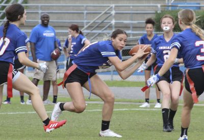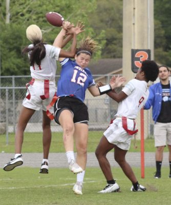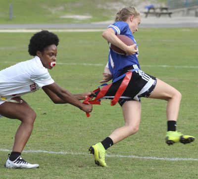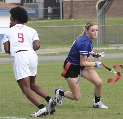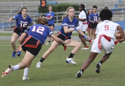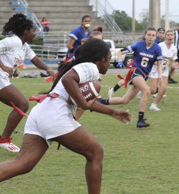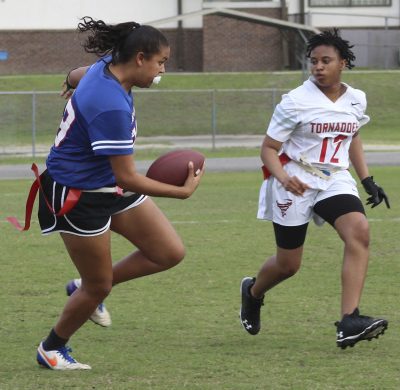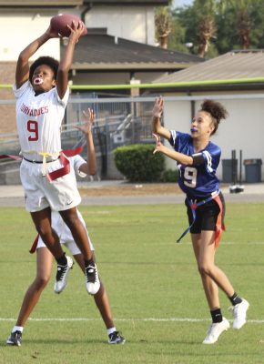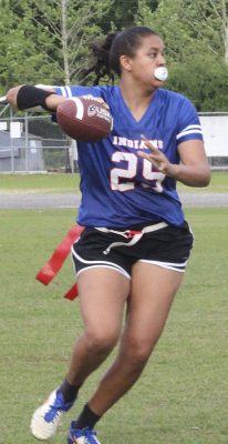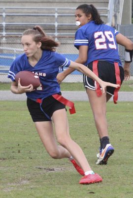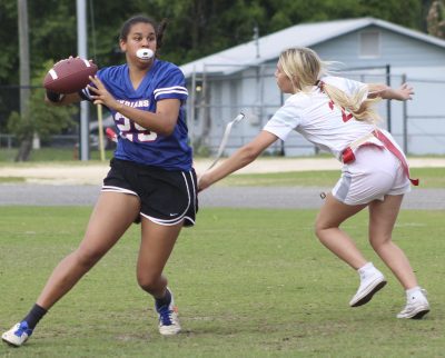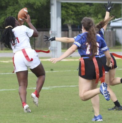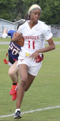 Quarterback Nichelle Brown accounted for three touchdowns and also made two interceptions on defense in the Bradford High School girls flag football team’s 19-6 win over host Keystone Heights on April 6.