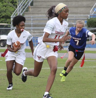 A pass breakup by Aiyana James and a tackle by Ashley McCarthy helped force the Tornadoes’ offense to punt after three plays.