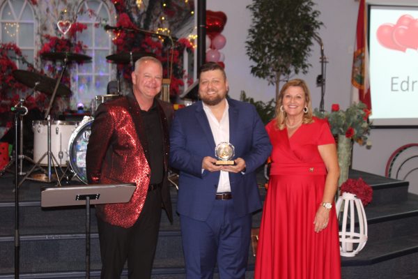 Oody and Chamber President Pam Whittle awarded the Judy Becker Volunteer of the Year award to Edrick Hamilton of 12G Mentoring.