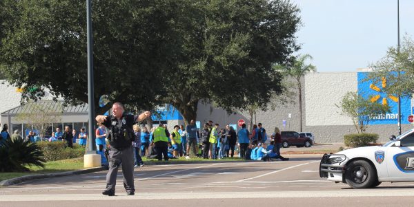 Starke police direct traffic to bypass Walmart while store employees wait in the parking lot.