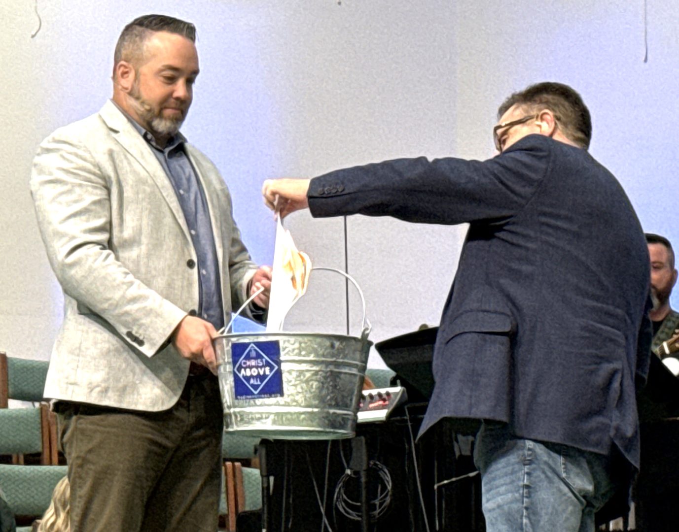 Senior Pastor Richard Cason said he had participated in several similar note-burnings in the past while holding a bucket for the occasion.