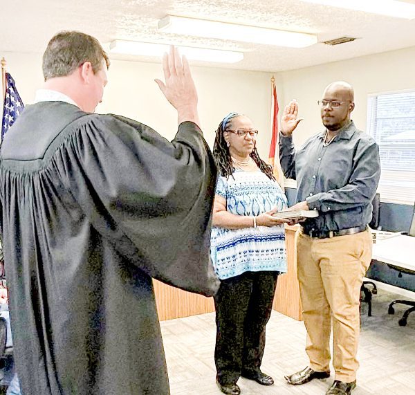 Joshua Bell, Lawtey’s newest councilman, was sworn in at the April council meeting by Judge Tatum Davis. Bell said he is ready to work to make a difference for his fellow citizens.