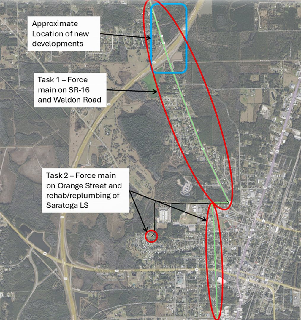 “Task 2 of the project, to be designed and constructed under a separate scope of work and a separate construction project, will include the design of a force main on Orange Street from West Weldon to the Starke Wastewater Treatment Facility, a distance of approximately 5,400 feet. The design and construction of the force main will include a railroad crossing. In addition to the force main on Orange Street, the project will include rehabilitation of the existing Saratoga Heights lift station on Todd Road, including replumbing of the lift station so that the discharge of the pumps connects to the existing force main on Todd Road and West Weldon Street.”