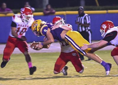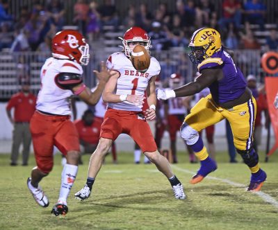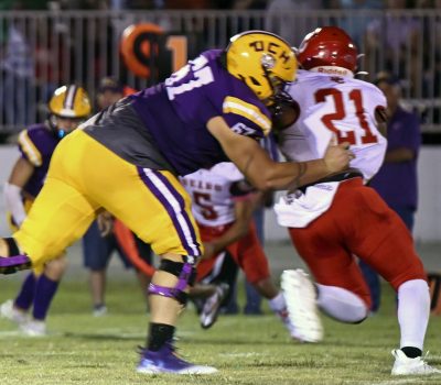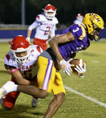 Defensive lineman Markus Strong (right) looks to disrupt a play in Dixie County’s offensive backfield. Photo by Jadee O’Steen.