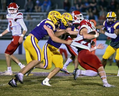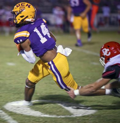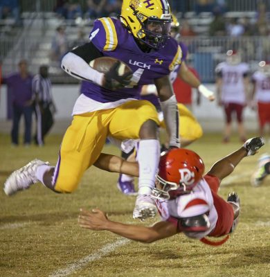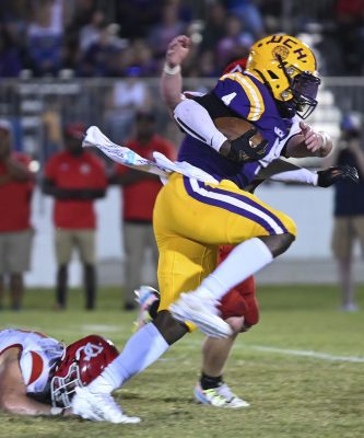 Running back Rayvon Durant (left) leaps his way out of a tackle. Photo by Jadee O’Steen.