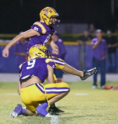 Jonathan Edwards kicks one of his six extra points. Photo by Jadee O’Steen.