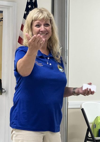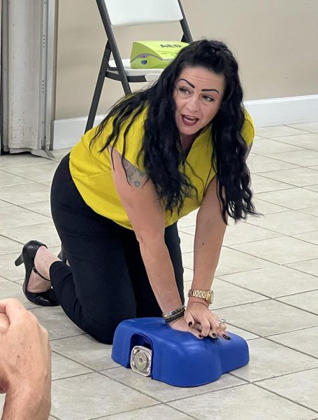 Guest speaker Jennifer Silvey, Emergency Preparedness Manager at UF Health Jacksonville, spoke about how critical CPR is with the motto of “Staying Alive” – continual compressions- and why people of all ages should learn CPR. She then demonstrated CPR basics and how the AED defibrillator worked. She briefly spoke about child and infant CPR, too. Silvey stressed that bystanders should always call 911 for all medical emergencies.