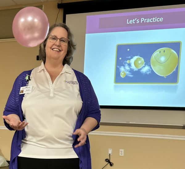 The Community Hospice staff member demonstrated one game using a balloon, in which two participants tossed the balloon to one another and alternatively recited letters in the alphabet. She then increased the complexity of the exercise by substituting words beginning with consecutive letters instead of the letters themselves. Instead of A-B-C, participants recited Apple, Bat, and Cat.