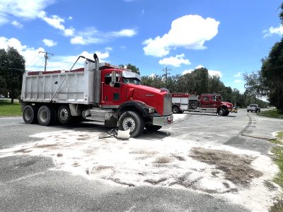 A dump truck collided with a car, leaving the car damaged on all sides and causing oil to spill on the road from both vehicles. As a result, State Road 100 was closed in one direction for several hours.