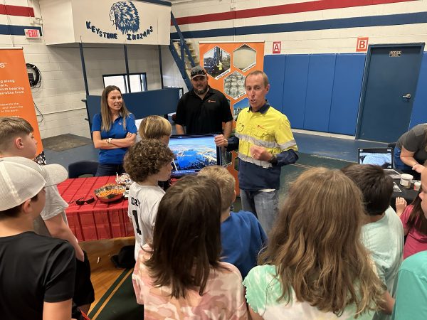 “Do you like digging in the dirt? asks Chemours Safety and Health Manager Chris Thomas (right). “That’s what we do.” Also representing the mining company are Krystal Phillips and Willie McCall. Photo: Dan Hildebran, Telegraph Staff Writer.