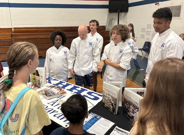 Keystone Heights High School culinary students (l-r) Byiah Myles, Gavin Koziol, Alex Goforth and Deshawn Bostic tell students about careers in the culinary arts. Photo: Dan Hildebran, Telegraph Staff Writer.