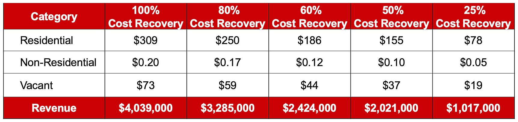 As previously stated, residential properties are charged per dwelling unit (including multifamily dwellings and apartments), nonresidential properties including businesses, churches, etc., can be charged based on square footage, and vacant parcels pay a flat fee regardless of size.