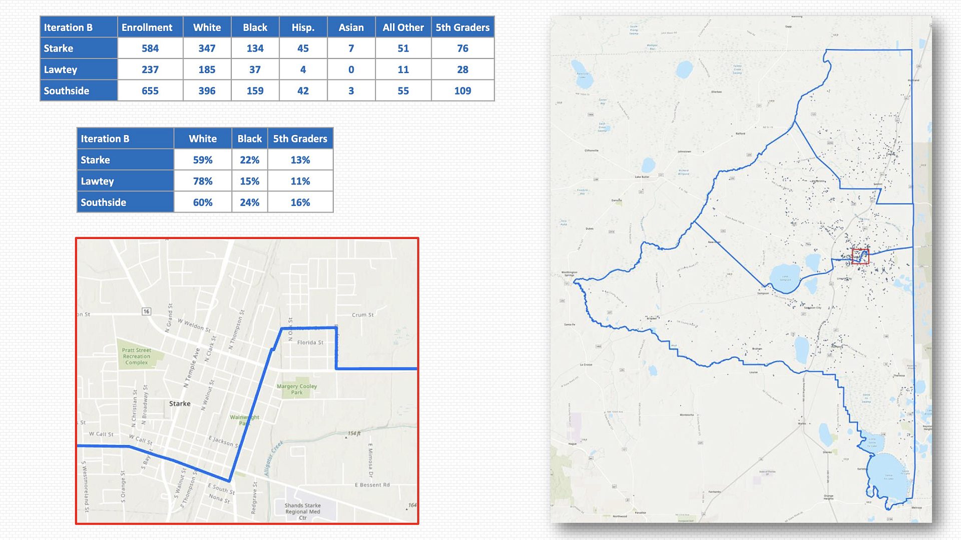 The proposals take K-5 student numbers into consideration only and impact the current number of students enrolled at each school very little. Lawtey Elementary remains under capacity, but that is because shifting its zone any further south would result in further diluting the school’s diversity by adding additional white students. The Lawtey zone in untouched in either of the two proposals.