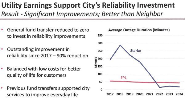 He also compared the average of municipal power customers’ costs per 1,000 kWh to those served by investor-owned utilities. Between 2015 and 2024, municipal customers’ bills were up an average of 8% while IOU customers’ bills were up an average of 26%. Plus, he said 2024 comparisons showed Starke’s average bills were also low when compared to other municipal utilities. This rate spread will only increase as Florida Power & Light seeks rate hikes, he said.