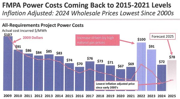 Prices are based on generation costs, which are driven by the cost of fuel. Spikes in FMPA’s costs have mostly reflected high natural gas prices given the amount of natural gas generation in the mix. Williams also mentioned the impact of inflation, which when taken into consideration places FMPA’s wholesale price at the same levels as the late 1990s and early 2000s.