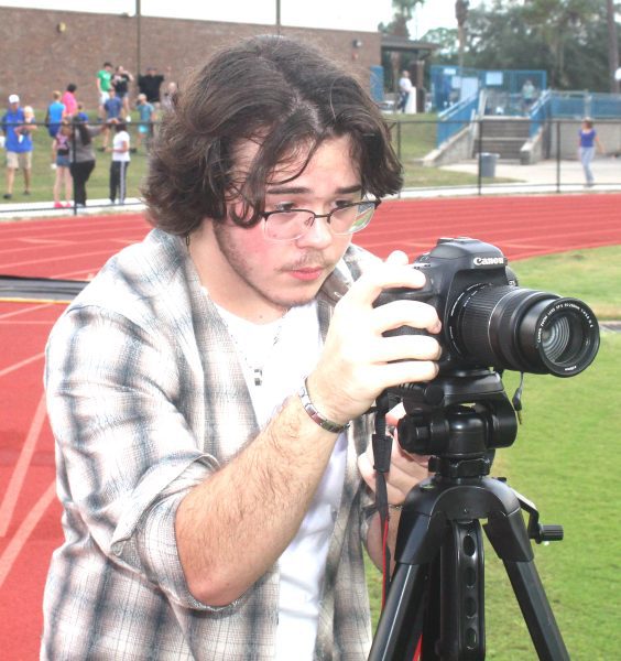 Yearbook editor Trace Keen prepares to shoot some photos before the game. Keen said this is his first year participating in the yearbook. Asked why he volunteered, the senior said he started drawing as his artistic expression, but switched to photography, starting with his phone. “Then my friend’s mom let me play around with one of her cameras and I took her son’s prom photos,” Keen recalled. “They came out really well, and she hadn’t used her camera in 10 years, so I just started using it and taking pictures wherever I could.”