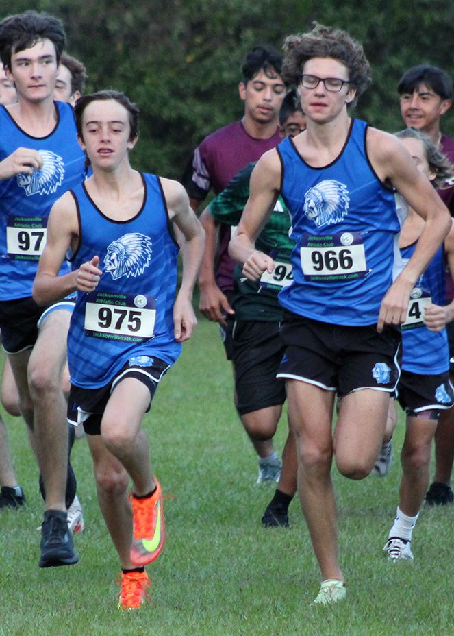 Ryder Thomas and Tyler Griffin (foreground, l-r) placed 11th and eighth, respectively, at the Run Matanzas Invitational. Also pictured is Anthony Peak (background, far left), who placed 52nd out of 202. File photo by Cliff Smelley.