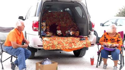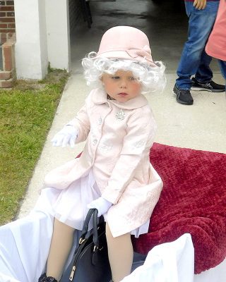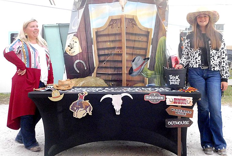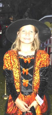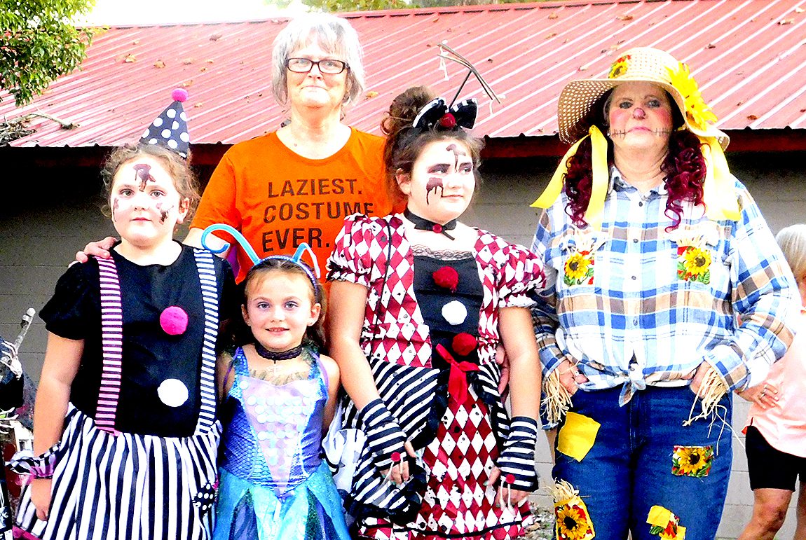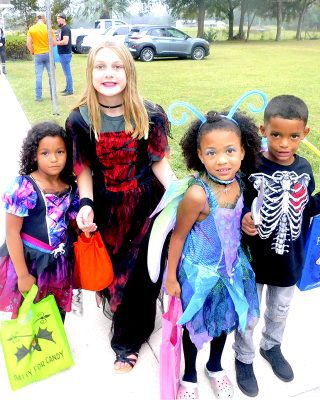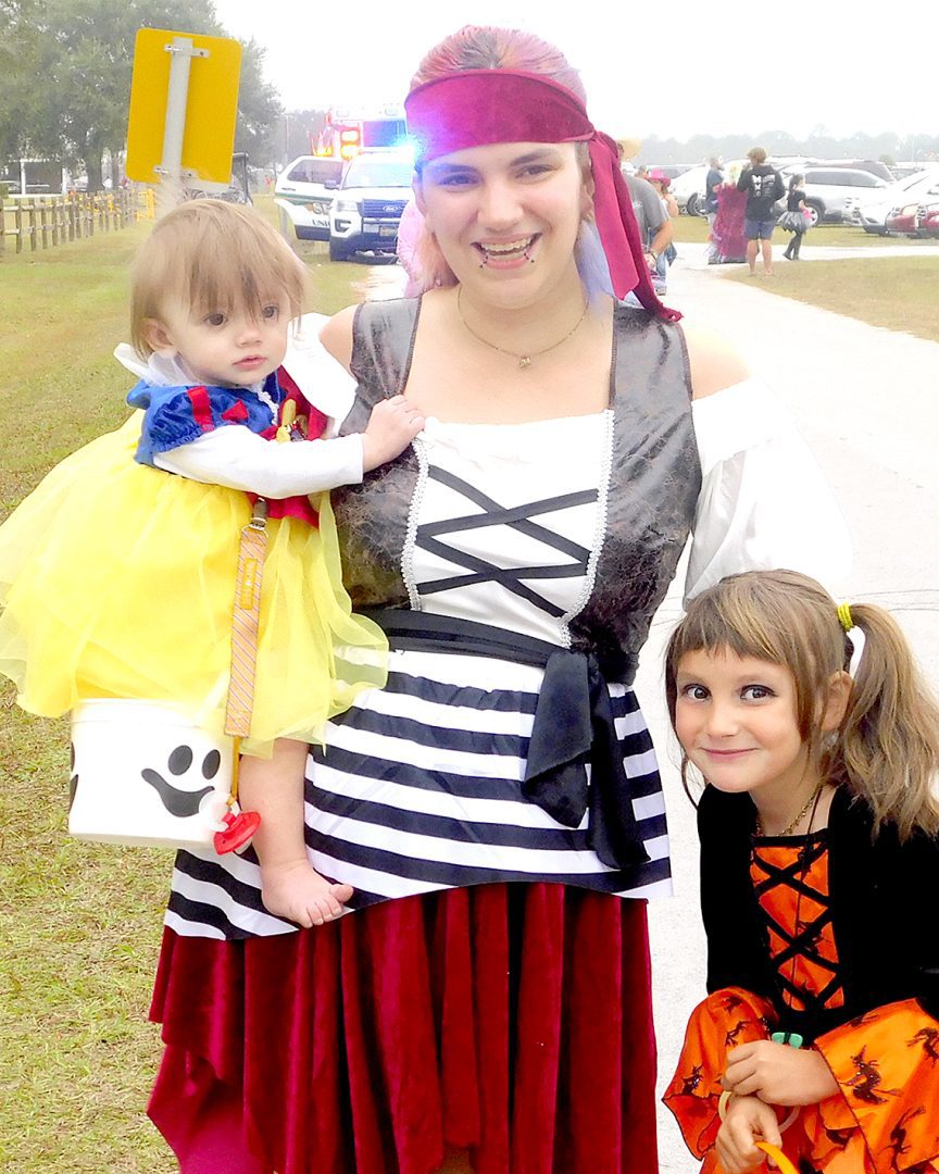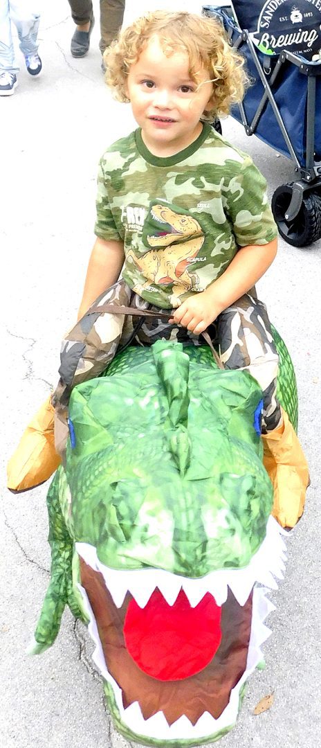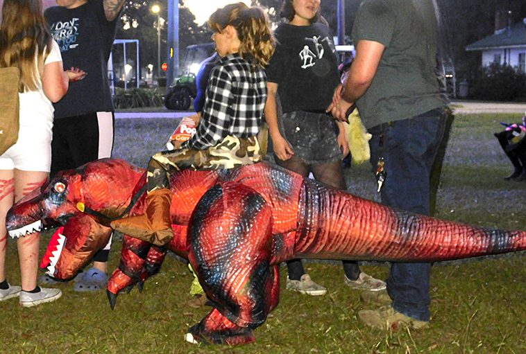 The dinosaurs were numerous at the Fall Festival at the First Christian Church of Lake Butler as well as the RMC. Here, Emi Vandervort expertly handles her red T-Rex , Penelope.Maggie Finley came dressed as a classic witch, but in updated colors, and she still looked great at the FCCLB fall festival.The main characters from Alice in Wonderland were on hand at FCCLB to give out treats to all the kids. Pictured are: Casey Rhodes (as Alice), Lauren Rhodes (the white rabbit) and Amanda Rhodes (the mad hatter). The Cheshire Cat had been on hand earlier, but he was sleeping in the car when this picture was taken.Brynli, BreyElla and Brytyn Raulerson and Becky Redding with B-Squared Owner Cindy M. Thomas (in back) at the Trunk-or-Treat event next to the bakery.Addyson and Kasey Kelley, with Kettle Creations, brought a taste of the Olde West to the Trunk-or-Treat, as well as bringing plenty of candy.Billy and Norma Osteen brought along her collection of handmade gnomes and, of course, they also brought candy to the Trunk-or-Treat event.Pirate girl Hope Sanders with her daughters Emily Dove (left) and mischevious looking Bella Sanders (right) outside the RMC residential complex.She’s got the look, the hat and the dress just right, as Paxley Gladding, dressed as the recently deceased Queen Elizabeth, rides through the RMC grounds in a carriage (little red wagon) pulled by her grandfather.Aliyah McCall, Madison Parker, Trinitie McCall and Dvante McCall banded together to brave the crowd at the RMC on Oct. 29.Elijah Seymour was one of several T-Rex riders at the RMC this year and he kept his mount under perfect control throughout the event.Is it safe to take a skunk trick-or-treating? It was when you are Shea Speer and you are taking your son, Derrin, to the RMC to collect some candy.Everyone was getting into the costume craze at the RMC event, even Mikaela Whitlock’s miniature schnauzer, Sheila, seems to enjoy participating dressed as a pig.