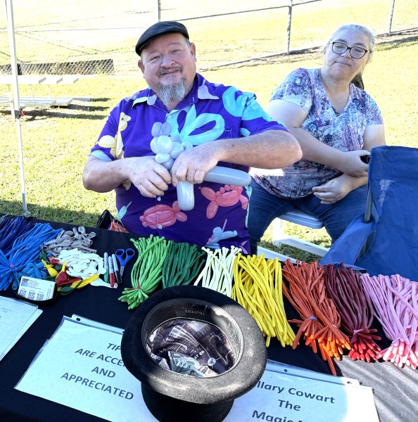 Hillary “The Magic Man” Cowart gives away balloon art during the celebration while his wife Ginnie looks on.
